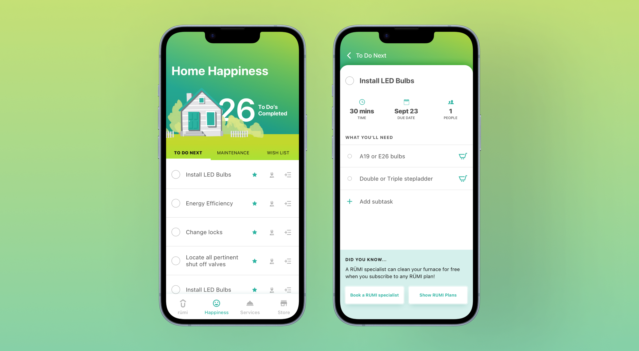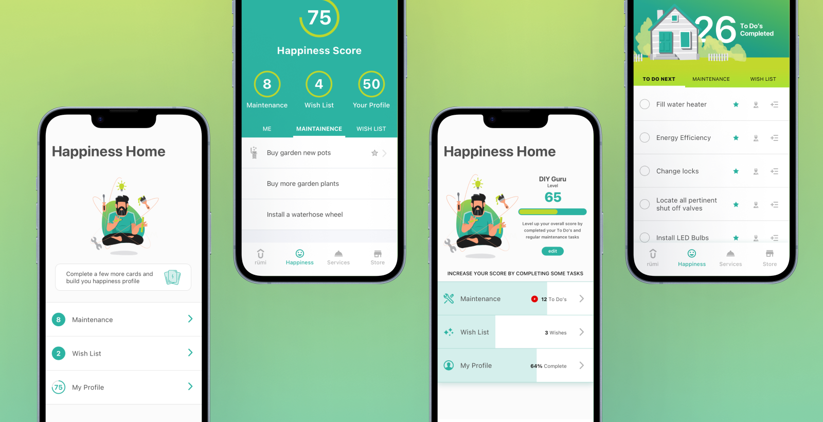 Tracking regular maintenance and managing new DIY projects can be overwhelming for new homeowners. ATCO wanted to help Albertans stay on top of repairs, installations, and maintenance, while also providing products to make their homes even more enjoyable. Enter Rümi, the home happiness app designed to help homeowners fall even more in love with their space. How might we help homeowners feel confident managing home tasks while surfacing ATCO's trusted professional services and e-commerce offerings in a natural, useful way?