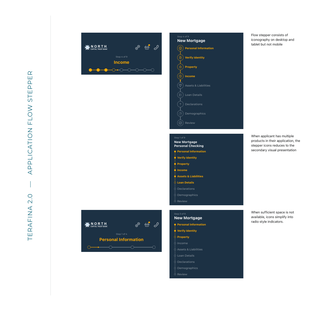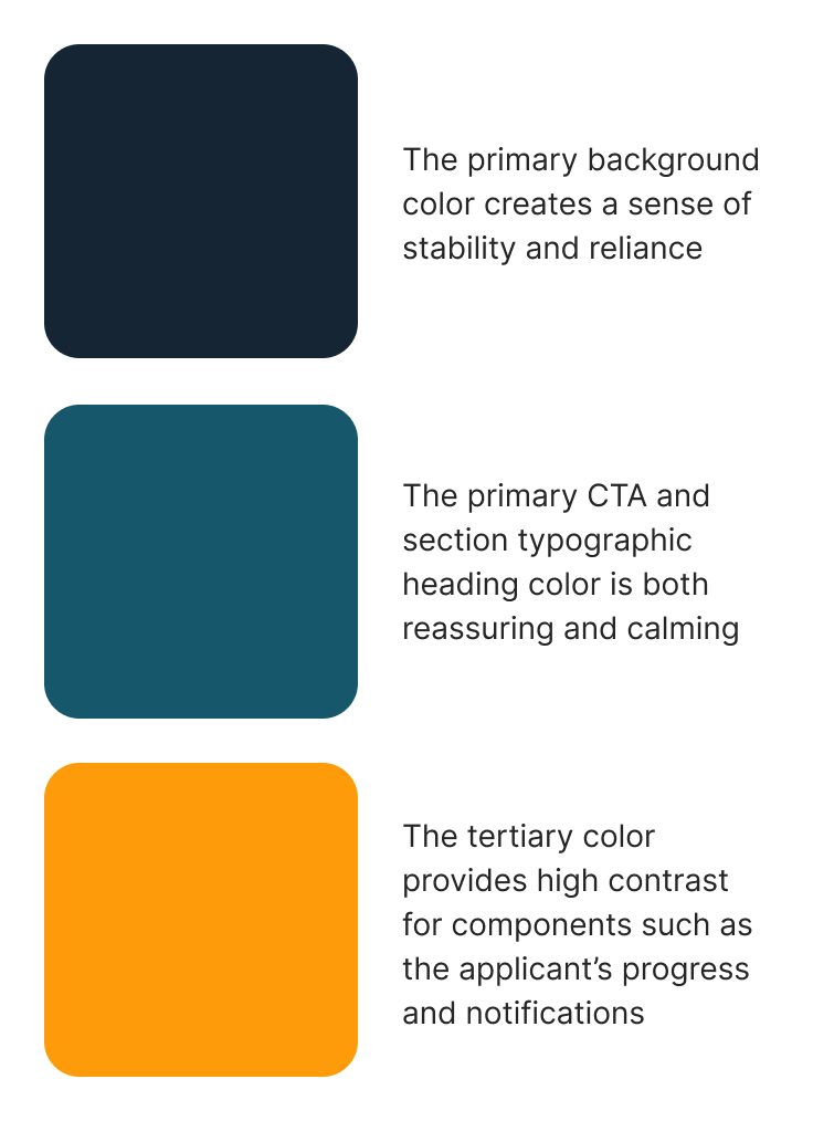 The progress stepper UI was not available on mobile, which was a critical gap that needed to be addressed. The updated version, incorporating the new color scheme, offers high contrast to clearly indicate the applicant's current position in the flow and how much remains to be completed.